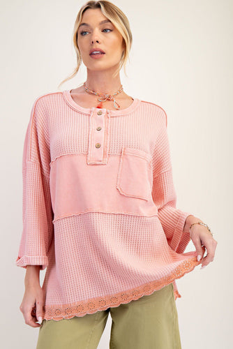 Easel Lace Hem Mineral Washed Thermal Knit Henely Top