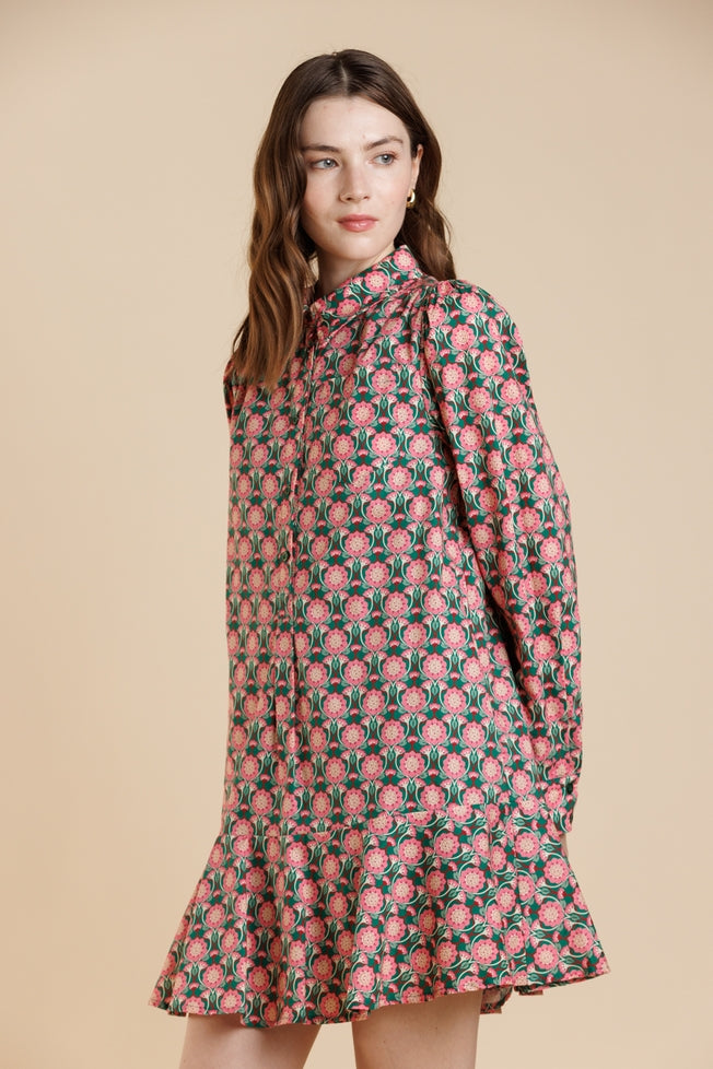 Lightweight cotton floral fabrication Shirt collar with button-down front Long sleeve design with cuff finish Relaxed fit Mini length