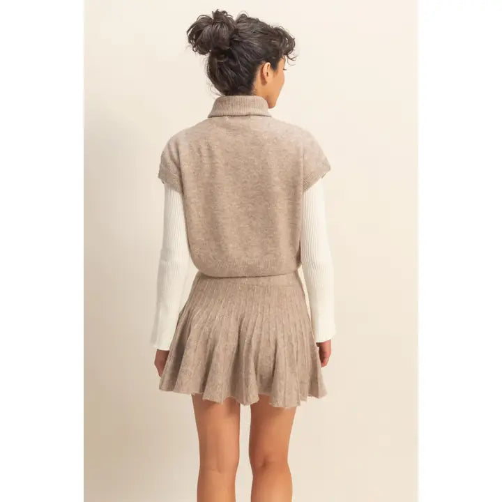 Embrace elegance with this coordinated set featuring a plush turtleneck top and a dynamically pleated skirt. The top's snug fit and structured cap sleeves enhance comfort, while the skirt's fluttering pleats offer a playful yet refined silhouette. Perfect for versatile styling, this set transitions effortlessly from brunch to a sophisticated evening. Pair with sleek boots or layer with a tailored blazer for season-spanning chic.